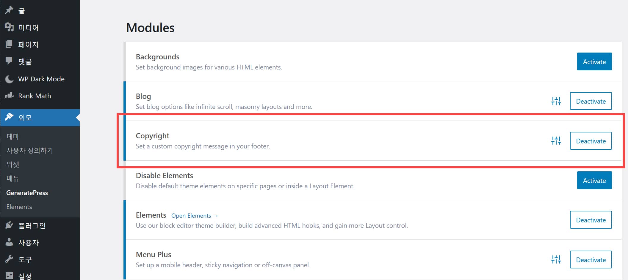 워드프레스 유료 테마에서는 푸터에 표시되는 Copyright 문구를 변경할 수 있는 옵션을 보통 제공하지만, 무료 테마에서는 대체로 그런 옵션이 제공되지 않습니다. GeneratePress 테마에서도 프리미엄 버전에서는 테마 옵션 내에서 변경이 가능하지만 무료 버전에서는 저작권 문구를 변경하는 옵션이 지원되지 않습니다. 그러나 후크를 사용하여 쉽게 변경이 가능합니다.속도가 빠른 워드프레스 테마를 원하는 경우 GeneratePress 테마가 좋은 선택일 수 있습니다("워드프레스 GeneratePress 테마: 구글 페이지 스피드 인사이트 점수" 참고).[ 이 글은 2023년 8월 19일에 마지막으로 업데이트되었습니다. ]워드프레스 GeneratePress 테마 Copyright 문구 변경하기Generate..