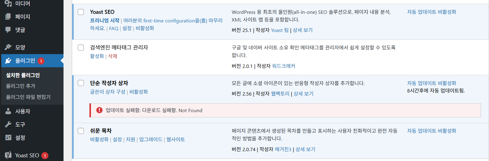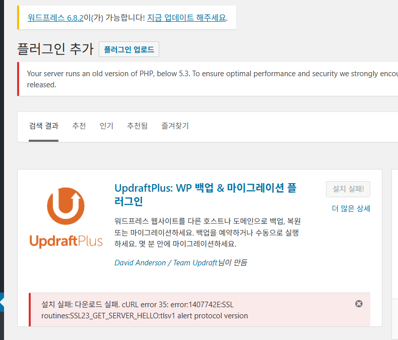워드프레스에서 테마나 플러그인을 설치하기 위해 테마나 플러그인을 검색하여 설치를 시도할 때 '설치 실패: 다운로드 실패. cURL error 35: error:1407742E:SSL routines:SSL23_GET_SERVER_HELLO:tlsv1 alert protocol version' 오류가 발생하면서 다운로드에 실패하는 경우가 있습니다.워드프레스 'cURL error 35: error:1407742E:SSL routines...' 오류LGU+에서 호스팅 중인 워드프레스 사이트를 카페24 호스팅을 이전하기 위해 UpdraftPlus 백업 & 마이그레이션 플러그인을 설치하려고 시도하니 위의 그림과 같이 'cURL error 35' 에러가 발생하면서 설치에 실패하는 문제를 최근 경험했습니다.이 오류는..