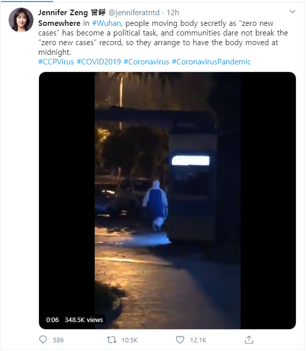 어제 중국에서는 처음으로 코로나19 신규 사망자가 발생하지 않았다고 보도되었습니다. 사실 '정말로 중국에서 신규 사망자가 한 명도 발생하지 않았을까'의구심이 든 사람들이 많을 것 같습니다. 중국 처음으로 코로나19 신규 사망자 ‘0’ 중국이 코로나19의 종식 수준을 밟는 가운데 관련 통계 발표 이후 처음으로 신규 사망자가 나오지 않았습니다. 중국 국가위생건강위원회는 어제 하루 동안 발생한 중국 본토의 코로나19 신규 확진 환자는 news.kbs.co.kr 해외에서는 재미있는 트위터 트윗이 회자되고 있습니다. Jennifer Zeng 曾錚 on Twitter “Somewhere in #Wuhan, people moving body secretly as "zero new cases" has become a ..