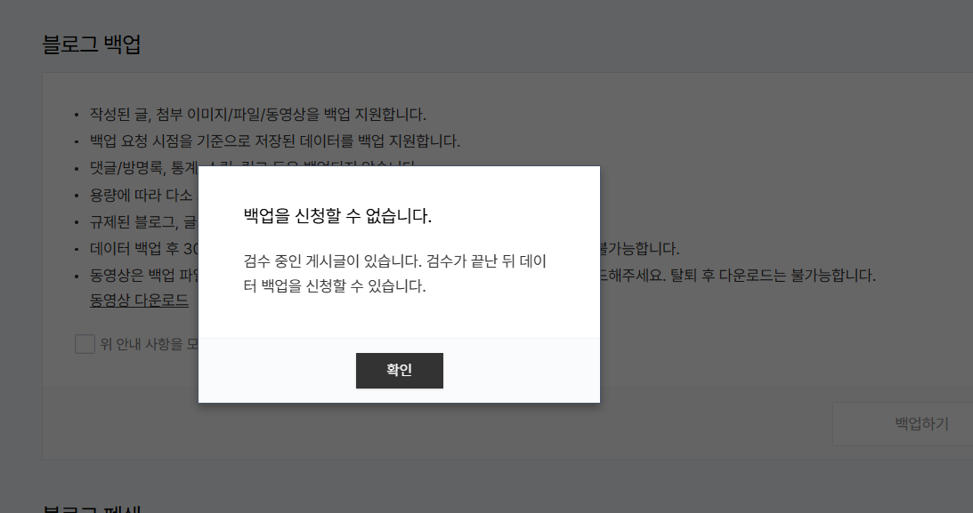 지난 수요일에 티스토리 데이터를 백업하려고 시도하니 '백업을 신청할 수 없습니다. 검수 중인 게시글이 있습니다. 검수가 끝난 뒤 데이터 백업을 신청할 수 있습니다' 경고가 표시되면서 백업이 되지 않았습니다.이 문제는 아마 업로드된 일부 이미지에 대하여 불법 촬영물이 아닌지 필터링하면서 발생하는 것 같습니다. 별 문제가 없으면 며칠 지나면 문제가 해결되고 백업이 정상적으로 될 것입니다.'검수 중인 게시글이 있습니다' 경고로 인한 티스토리 데이터 백업 불가능검수 중인 게시글이 있다는 경고가 표시되어 최근 올린 글을 살펴보니 업로드한 이미지 중 하나가 아래와 같이 "전기통신사업법 및 시행령에 따라 불법촬영물 등 여부를 검토중입니다. 잠시 후 새로고침 해보세요"가 표시되면서 이미지가 표시되지 않는 현상이 발생했..
