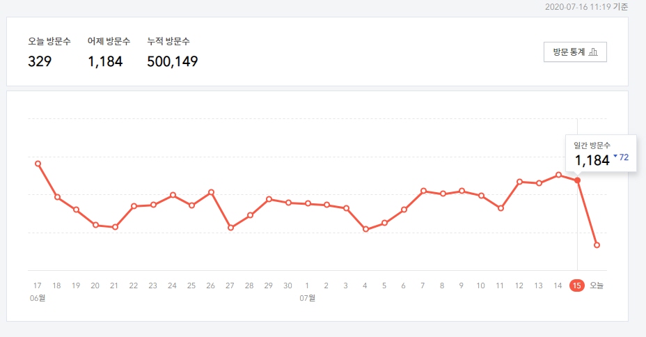 이 티스토리 블로그를 시작한 지 약 1000일이 되었습니다. 1000일 만에 누적 방문수 50만 명을 돌파했습니다. 방문자 수 50만은 사실 그리 큰 수치가 아니지만, 나름 의미 있는 숫자 같아서 별도의 포스팅을 통해 블로그를 되돌아보는 시간을 가져보았습니다. 티스토리 누적 방문수 50만 명 돌파 이 티스토리 블로그는 주력 블로그가 아니라서 그리 많은 신경을 써지 않았습니다. 실제로 메인 블로그에 비해 방문자 수가 현저히 낮은 수준입니다. 이 블로그는 2017년 10월에 시작하여 어제 누적 방문자수가 50만 명을 돌파했습니다. '워드프레스 일기' 블로그는 기술적인 내용이 많기 때문에 방문자 수가 제한적이지만, 최근 방문자가 조금씩 상승하고 있습니다.ㅎ 초기에는 네이버 유입 덕분에 비교적 많은 방문자가 유..