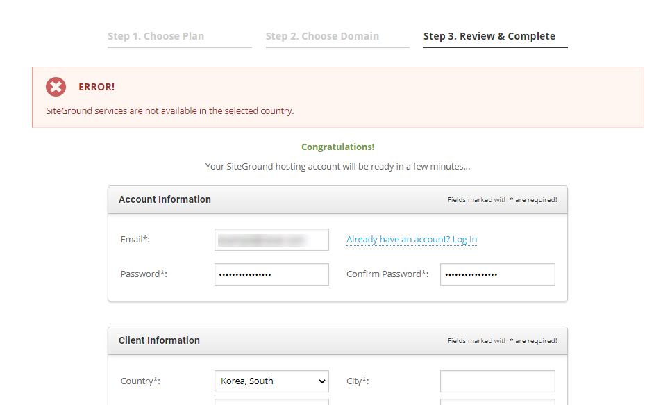 사이트그라운드 서비스 가입 불가능 - 한국 등 일부 국가 서비스 중단 (SiteGround)