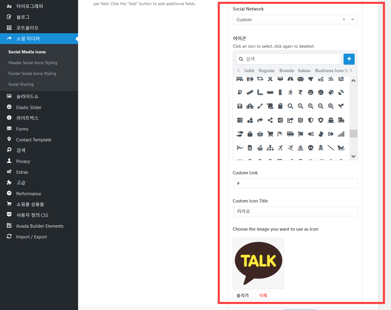 베스트셀링 워드프레스 테마인 아바다 테마에서는 소셜 미디어 아이콘을 추가할 수 있는 옵션이 제공됩니다. 예를 들어, 페이스북 아이콘을 클릭하면 사용자의 페이스북 페이지로 이동할 수 있도록 할 수 있습니다. 국내 소셜 네트워크 아이콘은 제공되지 않지만 카카오톡 페이지나 네이버 블로그, 네이버 카페 등으로 연결되는 아이콘을 추가하고 싶은 경우 커스텀 아이콘을 업로드하여 추가할 수 있습니다. 아바다 테마: 커스텀 소셜 미디어 아이콘 추가하기 (예: 카카오톡, 네이버 블로그 등) 워드프레스 Avada 테마에서 카카오톡이나 네이버 블로그 등으로 연결되는 소셜 아이콘을 추가하고 싶은 경우 먼저 커스텀 소셜 미디어 아이콘을 추가해야 합니다. 워드프레스 알림판 » Avada » Options » 소셜 미디어 » Soc..