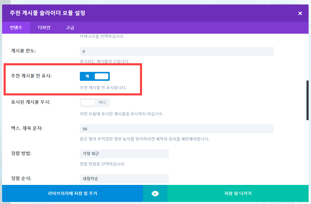 워드프레스 Extra 테마의 추천 게시물 옵션