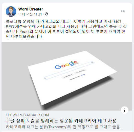 최근 Yoast SEO가 버전 13으로 업데이트되면서 소셜 미디어 오픈그래프 미리보기 기능을 프리미엄 버전에서 사용할 수 있다는 메시지가 글 편집 화면의 소셜 공유 설정에 추가되었습니다. Yoast SEO의 소셜 미디어 오픈그래프 기능 활성화 Yoast SEO에서 소셜 미디어 오픈그래프 기능을 활성화하면 워드프레스 글을 페이스북, 트위터, 네이버 블로그, 네이버 카페, 카카오톡 등에 공유할 경우 썸네일과 제목 및 설명이 표시됩니다. 워드프레스 블로그 글이 네이버 블로그 섹션에 노출되는 경우 소셜 공유 설정에서 지정한 썸네일 이미지가 네이버 검색엔진에 표시됩니다. Yoast SEO에서 페이스북과 트위터 소셜 미디어 오픈그래프를 사용하려면 먼저 SEO 메타 박스를 사용하도록 활성화해야 합니다. 워드프레스 알..